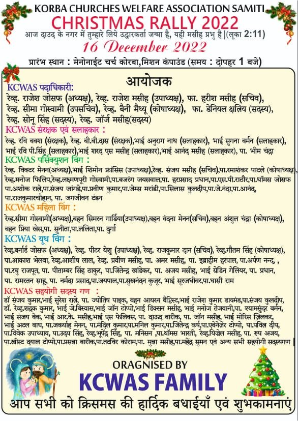 कोरबा। जिले में कोरबा चर्च वेलफेयर एसोसिएशन समिति (KCWAS) के द्वारा 16.12.2022 दोपहर 01:00 को मेनेनाइट चर्च मिशन रोड से सुभाष चौक निहारिका होते हुए घंटाघर तक क्रिसमस मसीही रैली का आयोजन किया गया है। बता दें कि पिछले कई वर्षों के बाद यह रैली निकाली जा रही है। करोना काल के बाद यह पहली भव्य एवं विशाल मसीही रैली होगी, जिसमें बढ़-चढ़कर सभी विश्वासी भाइयों एवं बहनों को सादर आमंत्रित किया गया है। कोरबा जिले के लागभग सभी चर्च इस आयोजन में सम्मिलित होंगे अनुमान लगाया जा रहा है कि आयोजित होने वाली क्रिसमस रैली काफी भव्य एवं विशाल होगी, रैली बाजे – गाजे के साथ धूमधाम से निकाली जाएगी जिसमे झांकी का आयोजन भी किया गया है। KCWAS के अध्यक्ष पास्टर राजेश जोसेफ ने जिले के सभी मसीही भाइयों एवं बहनों को आयोजन में शामिल होने के लिए निवेदन किया है।