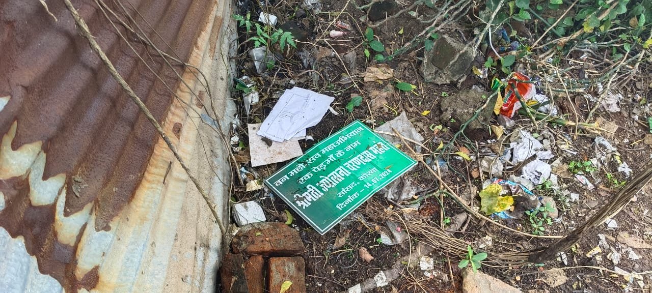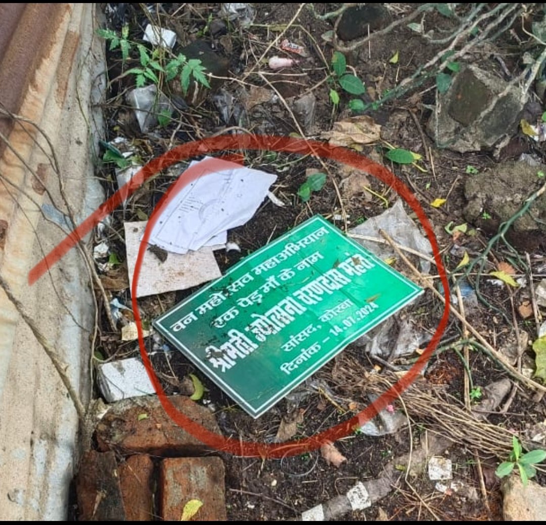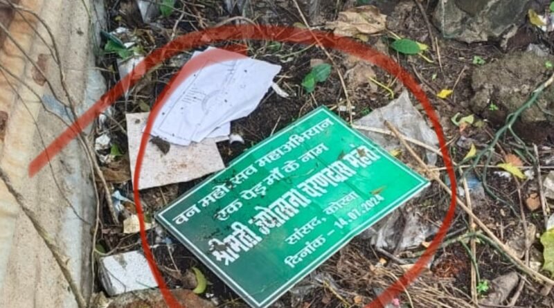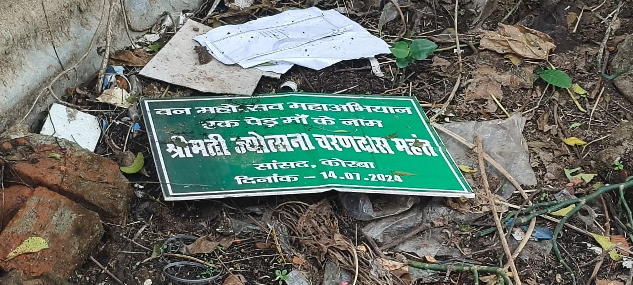 कोरबा/कटघोरा 2 अक्टूबर 2024 : छत्तीसगढ़ की विष्णुदेव सरकार द्वारा कुछ महीने पूर्व ही पूरे प्रदेश में वनमहोत्सव मनाया गया इसी तारतम्य में कटघोरा वन मण्डल द्वारा आयोजित 17 जुलाई को शासन के निर्देशानुसार एक पेड़ मां के नाम का कार्यक्रम आयोजित किया गया। इस कार्यक्रम में वन विभाग के समस्त अधिकारी कर्मचारियों के आलावा राजनीतिक जनप्रतिनिधि भी शामिल हुए थे। कार्यक्रम में पौधारोपण का कार्यक्रम सम्पन्न हुआ जिसमें सभी रोपित पौधों पर मुख्य अतिथि का नाम अंकित बोर्ड भी लगाया गया। लेकिन इस कार्यक्रम में कोरबा की वर्तमान सांसद ज्योत्सना चरणदास महंत का नाम अंकित बोर्ड महीनों बाद वनमण्डल कार्यालय के पीछे जिला सहकारी बैंक के पास कूड़े के पास पड़ा मिला।