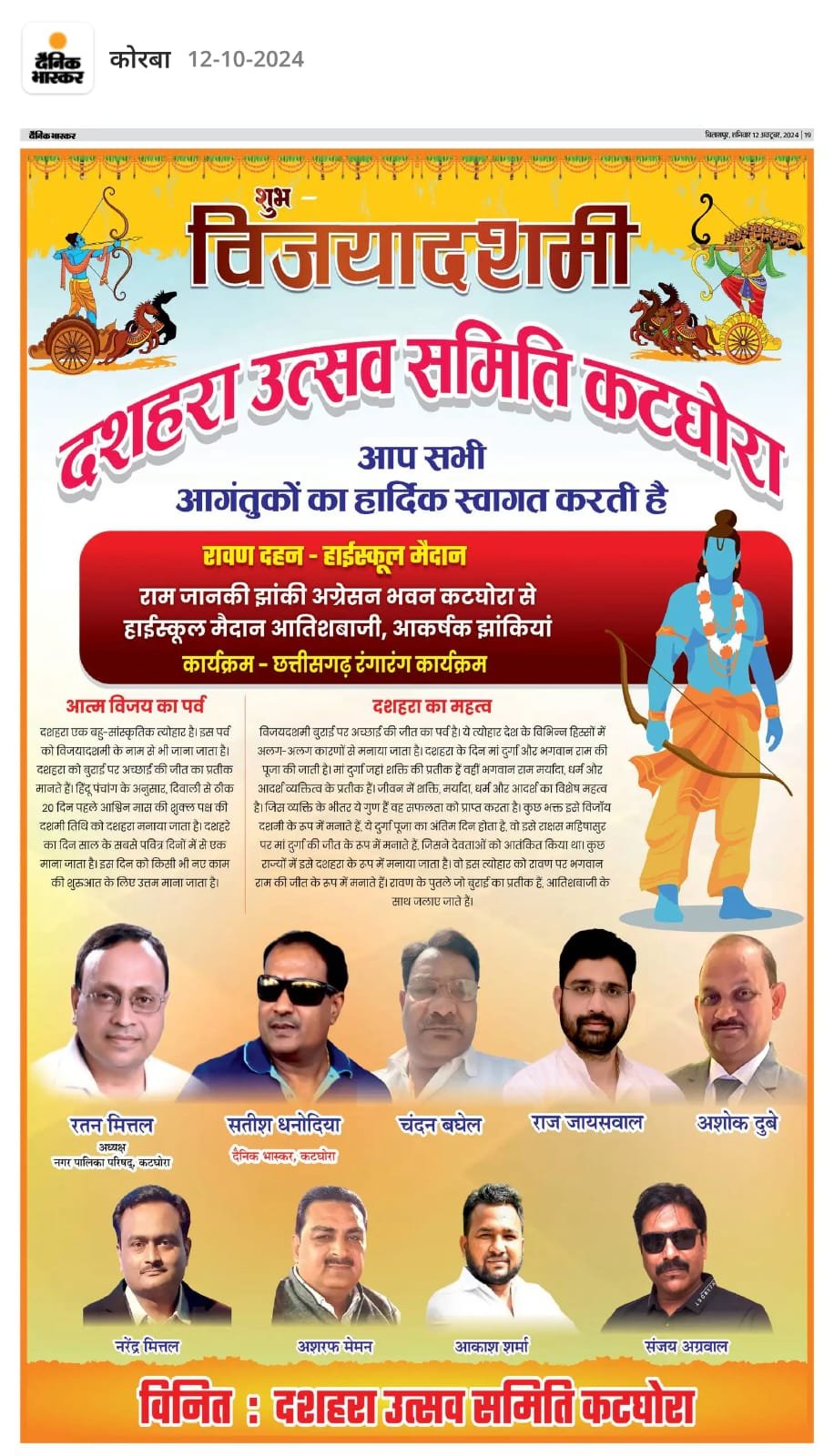 कटघोरा दशहरा उत्सव समिति के सदस्य के रूप में मुख्य रूप से समिति के संरक्षक व कटघोरा नगर पालिका परिषद के अध्यक्ष रतन मित्तल,संजय अग्रवाल,चंदन बघेल,अशोक दुबे,अशरफ मेमन, आकाश शर्मा,राज जायसवाल, नरेन्द्र मित्तल,रमेश मित्तल का मुख्य योगदान रहेगा।