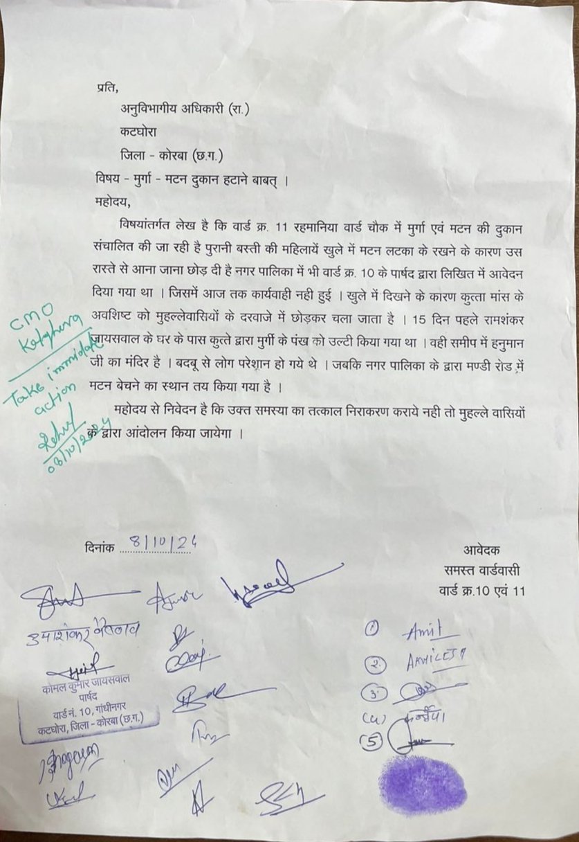 कोरबा/कटघोरा 28 अक्टूबर 2024 : कटघोरा नगर पालिका के वार्ड क्रमांक 11 रहमानिया चौक पर काफी दिनों से मुर्गा एवं मटन दुकान का संचालन किया जा रहा है। दुकान संचालक द्वारा खुले में मांस को लटका रख दिया जाता है। इस स्थान के आसपास हिदू देवी देवताओं के मंदिर होने की वजह से यहां निवासरत हिन्दू धर्म को मानने वालों के लिए उनकी धार्मिक आस्था को ठेस पहुंच रहा है। जिससे नाराज़ वार्डवासियों ने पार्षद के साथ कटघोरा अनुविभागीय अधिकारी कार्यालय में ज्ञापन सौपा।