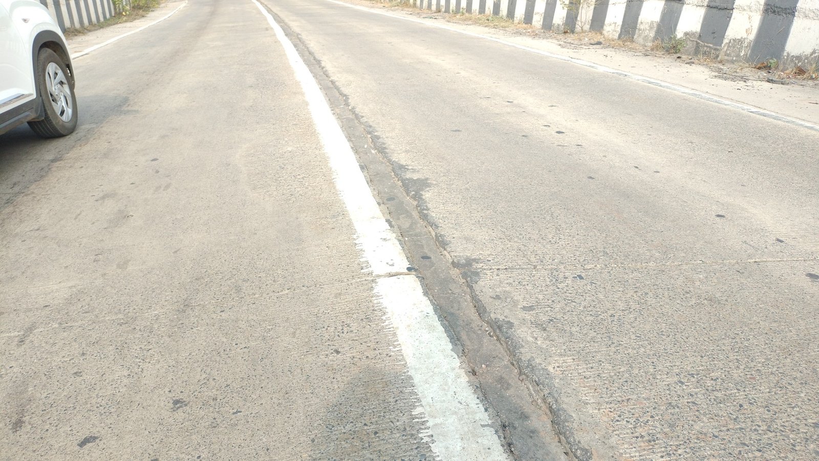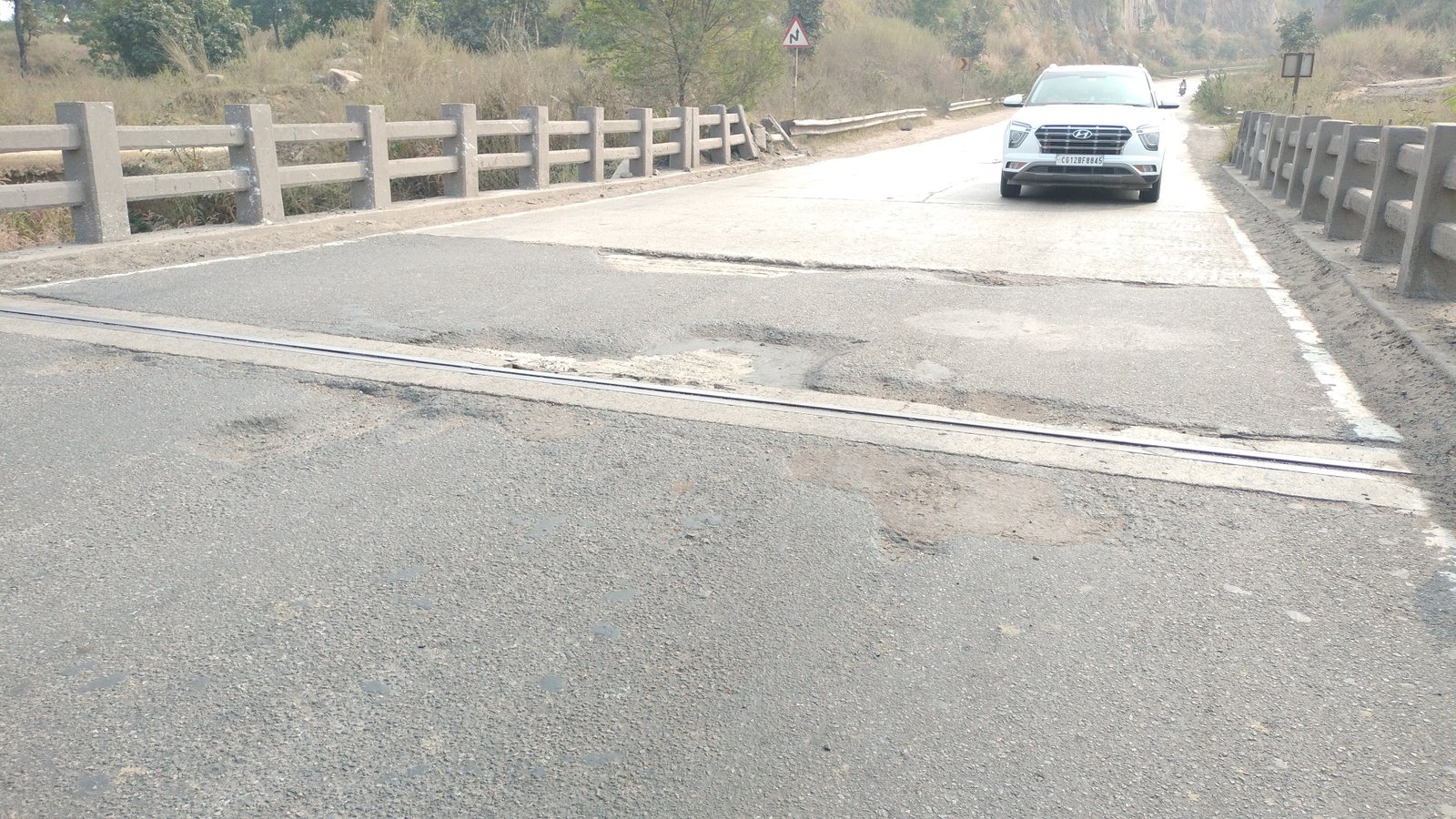 धंस रही सड़क, आ रही दरारे, पुल के पास हुआ बड़ा गड्ढा