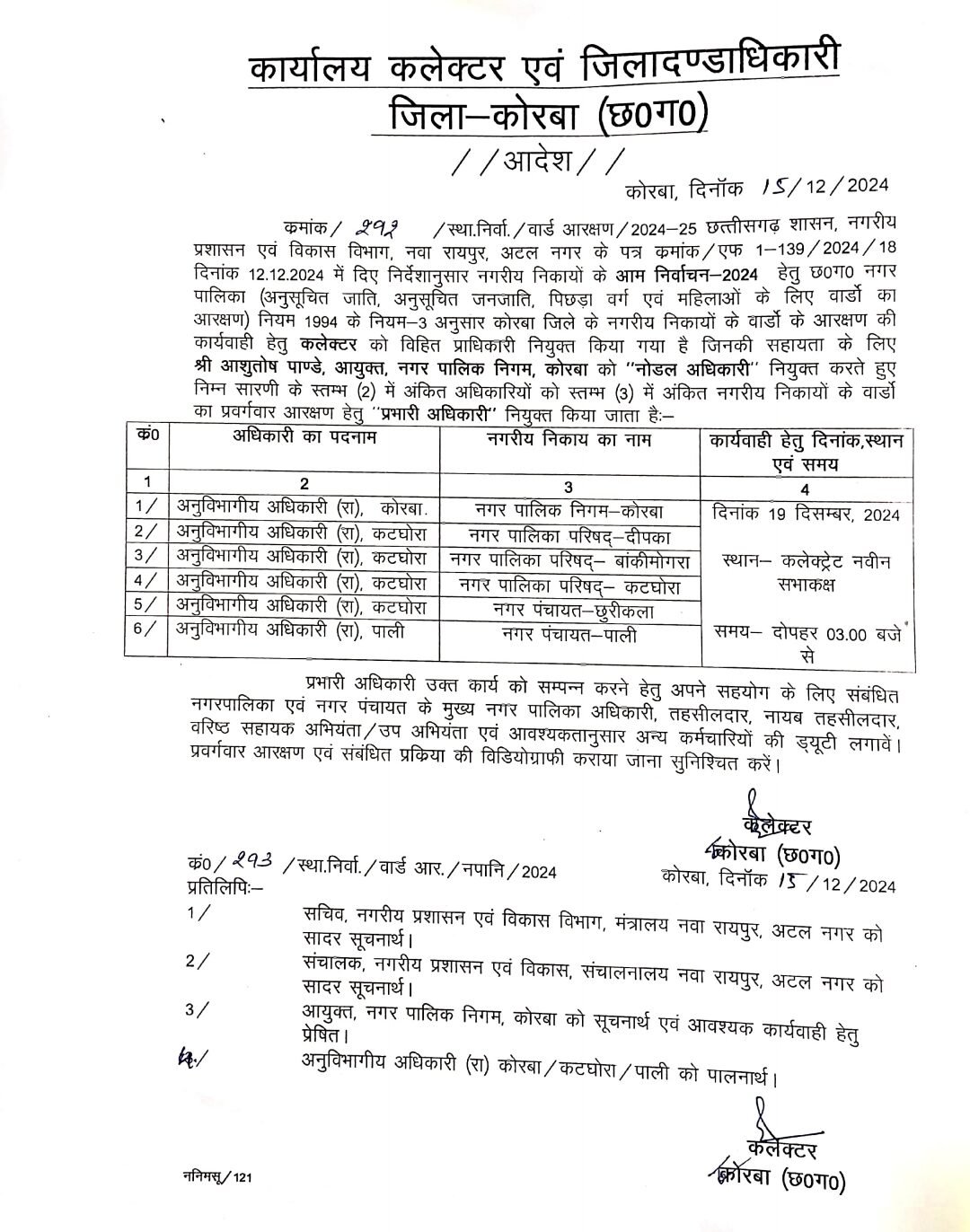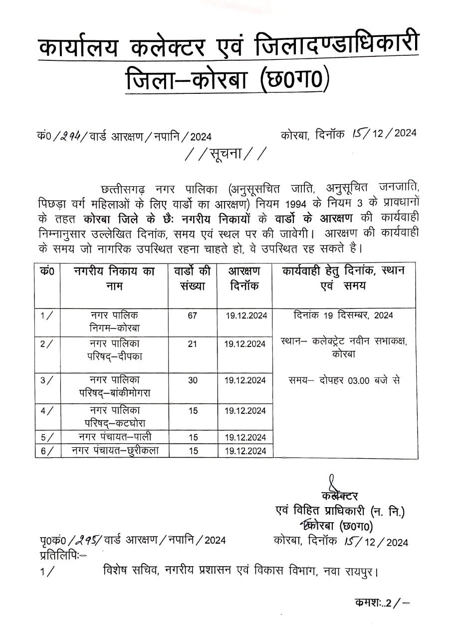कोरबा/कटघोरा 18 दिसम्बर 2024 : कोरबा नगर निगम के 67 वार्डों सहित नगर पालिका कटघोरा, बांकी मोंगरा, दीपका और नगर पंचायतों में छुरी और पाली के वार्डों की आरक्षण तस्वीर 19 दिसंबर को साफ हो जाएगी। कितने वार्ड ओबीसी कितने सामान्य व कितने आरक्षित के होंगे। कलेक्टर अजीत बसन्त के निर्देश पर नगर निगम आयुक्त आशुतोष पांडे को नोडल अधिकारी नियुक्त किया गया है। प्रभारी अधिकारी अशुयोष पांडे के निगरानी में कलेक्ट्रेट के नवीन सभाकक्ष में दोपहर 3 बजे से सबसे पहले नगर निगम के 67 वार्डों की लॉटरी निकाली जाएगी। इसके साथ ही कोरबा जिले के सभी निकायों के वार्ड आरक्षण की प्रक्रिया साफ होगी।