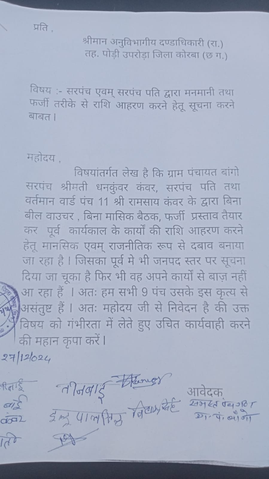 कोरबा/पोंडी उपरोड़ा 27 दिसम्बर 2024 : पोड़ी उपरोड़ा विकास खंड के ग्राम पंचायत बांगो बस्ती हमेशा से विवादों मे रहा है, सरपंच, ग्रामीण व पंचो के बीच सामंजस्य काफ़ी समय से चरमराई हुई है, आज बांगो पंचायत के 9 पंचो ने फिर एसडीएम पोड़ी उपरोड़ा से सरपंच के खिलाफ शिकायत दर्ज कराई है। शिकायत मे बताया गया की ग्राम पंचायत बांगो सरपंच श्रीमति धनकंवर और सरपंच पति व वार्ड 11 के पंच रामसाय कंवर द्वारा बिना बिल वाउचर, बिना मासिक बैठक के फर्जी प्रस्ताव तैयार कर पूर्व कार्यकाल के कार्यों की राशि आहरण करने के लिए ग्राम सचिव पर मानसिक व राजनितिक दबाव बनाया जा रहा है जिसका पूर्व मे भी जनपद स्तर पर सुचना दिया जा चूका है, फिर भी वह अपने कार्यो से बाज नहीं आ रहा। जिसकी शिकायत कई बार की गई।