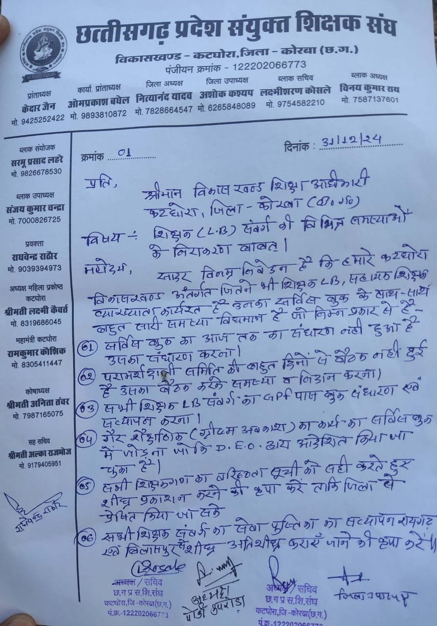 ktg news : छ.ग.प्रदेश संयुक्त शिक्षक संघ ने अनेक समस्याओं व उनके समाधान को लेकर कटघोरा BEO को सौपा ज्ञापन.