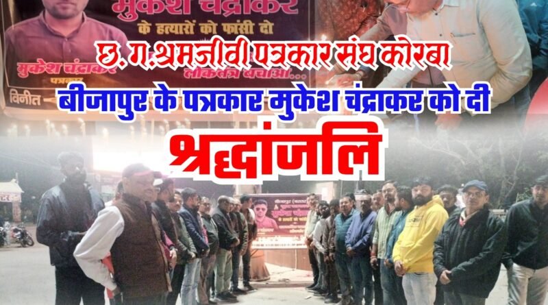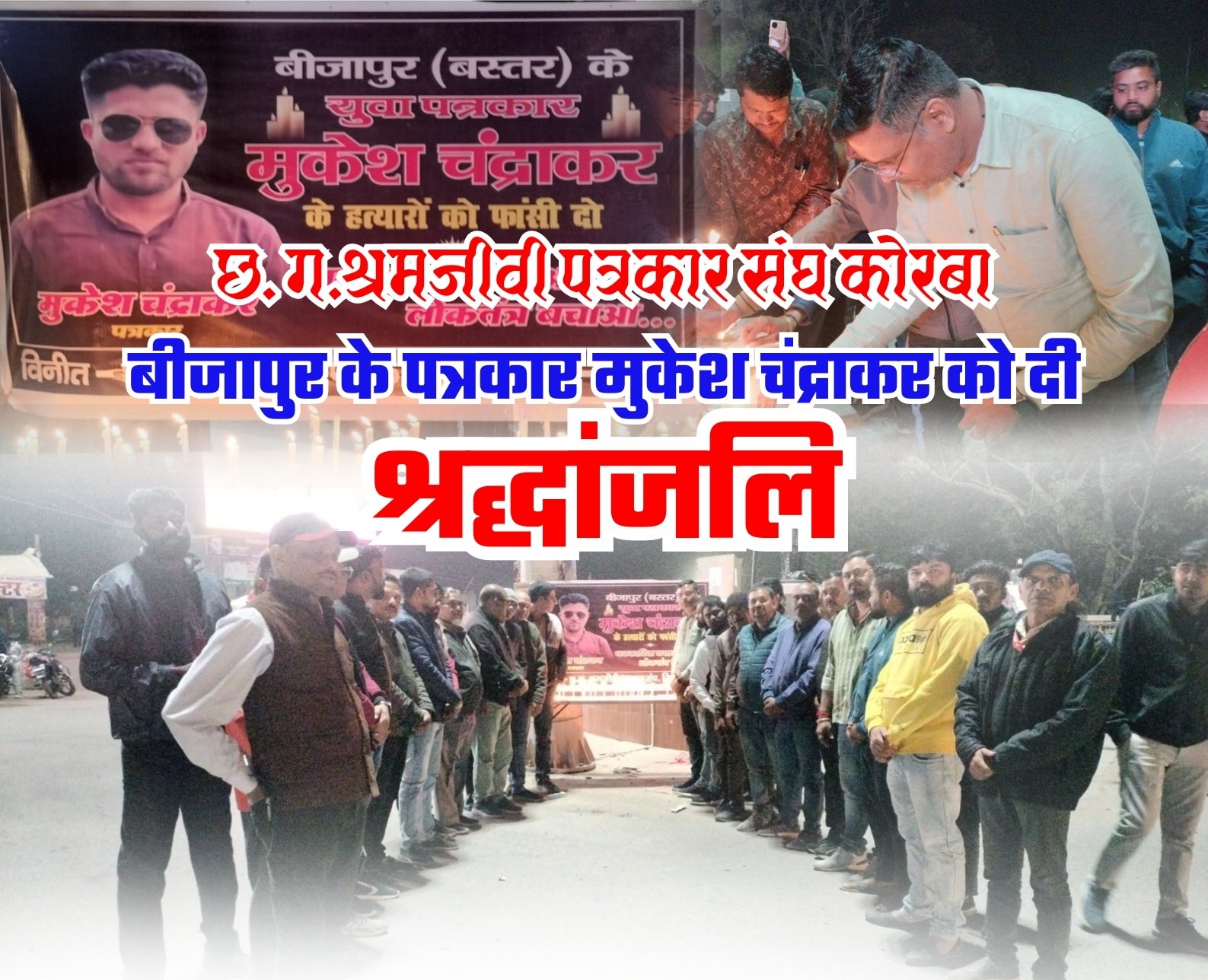 कोरबा/कटघोरा 8 जनवरी 2025 : बीजापुर के पत्रकार मुकेश चंद्राकर की हत्या का विरोध कोरबा जिले में भी देखने को मिला। बीजापुर जिले के पत्रकार मुकेश चंद्राकर की हत्या के विरोध में कोरबा जिला छत्तीसगढ़ श्रमजीवी पत्रकार संघ के सभी ब्लॉक इकाई के पत्रकारों ने बुधवार की शाम कैंडल जलाकर श्रद्धांजलि देते हुए विरोध जताया। छत्तीसगढ़ श्रमजीवी पत्रकार संघ कोरबा के विभिन्न अखबारों, चैनलों, प्रिंट मीडिया के पत्रकारों ने कटघोरा के शहीद वीर नारायण चौक पर इस जघन्य पत्रकार हत्या कांड के विरोध में कैंडल जलाकर कर प्रदर्शन किया। संघ के जिला उपाध्यक्ष व वरिष्ठ पत्रकार गोपाल मित्तल ने बताया कि इस घटना ने राज्य में पत्रकारों की सुरक्षा पर गंभीर सवाल खड़े कर दिए हैं। उन्होंने सरकार से मांग की, कि दोषियों को जल्द से जल्द गिरफ्तार कर कड़ी सजा दी जाए। बता दें, बीजापुर नक्सल क्षेत्र के लिए काम करने वाले स्वतंत्र पत्रकार मुकेश की हत्या से पत्रकारिता जगत में शोक की लहर है। पत्रकारों ने इसकी कड़ी निंदा करते हुए कठोर से कठोर सजा दोषियों को देने की मांग की है।