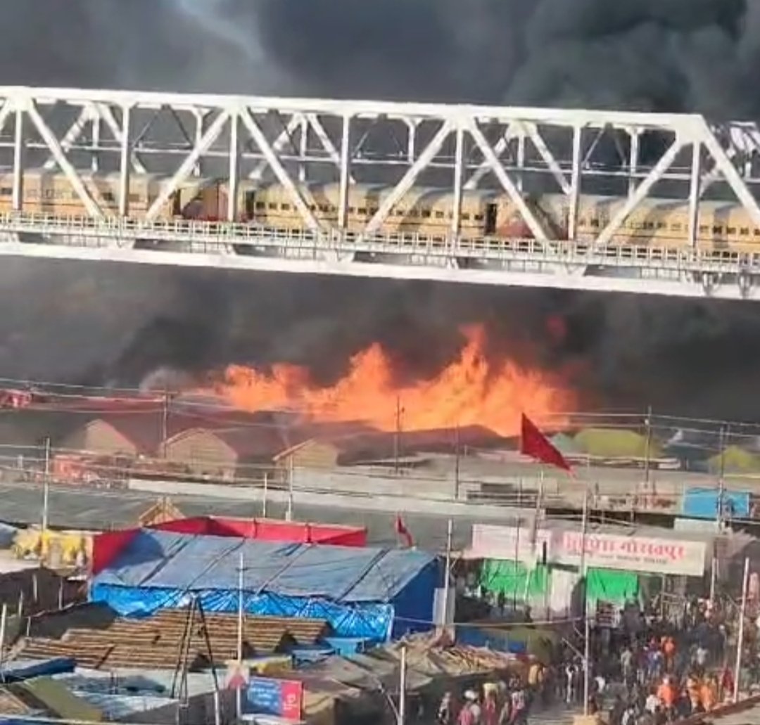 प्रयागराज 19 जनवरी 2025 : प्रयागराज महाकुंभ मेला क्षेत्र में भीषण आग लगने से अफरा-तफरी की स्थिति निर्मित हो गयी है। बताया जा रहा है कि यह आग इतनी भीषण है कि दूर से ही आग का गुब्बार दिखाई दे रहा है। वहीं आग बुझाने के लिए दमकल की गाड़ियां मौके पर पहुंच गई हैं और आग पर काबू पाने की कोशिश कर रही हैं। किसी चिंगारी या फिर शार्ट सर्किट से आग लगने की आशंका जतायी जा रही है। सिलेंडर ब्लास्ट होने के कारण भीषण आग कैम्प में फैल गयी और देखते ही देखते कुंभ के आस-पास लगे टेंट भी आग की चपेट में आने से खाक हो गये। वहीं भीषण आग से टेंटों में रखे सिलेंडर लगातार ब्लास्ट हो रहे हैं,जिससे आग और भयंकर रूप लेता जा रहा है। दमकल की टीम लगातार आग पर काबू पाने का प्रयास कर रही है। ताज़ा जानकारी में एक के झुलसने के खबर आ रही है उसे तत्काल एम्बुलेंस से अस्पाताल ले गई सुरक्षा की टीम.. आग के फैलने से मौके पर हड़कम्प मच गया है। फिलहाल दमकल की टीम आग पर काबू पाने का प्रयास कर रही है।