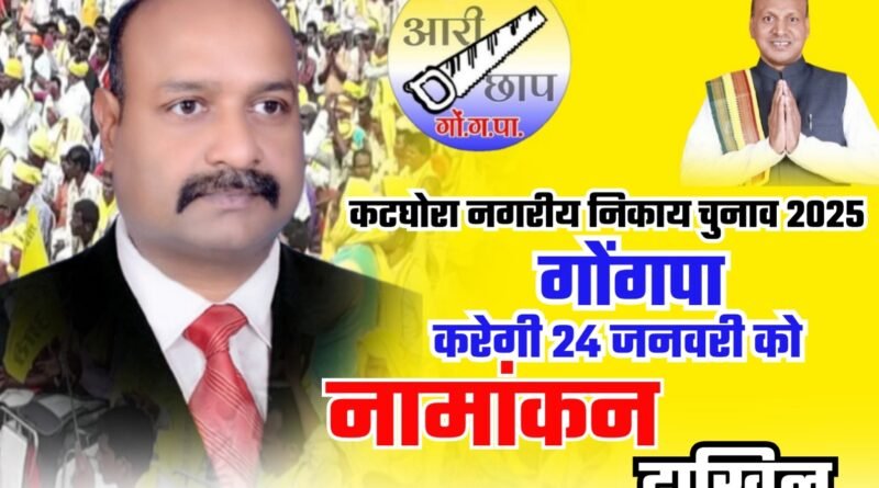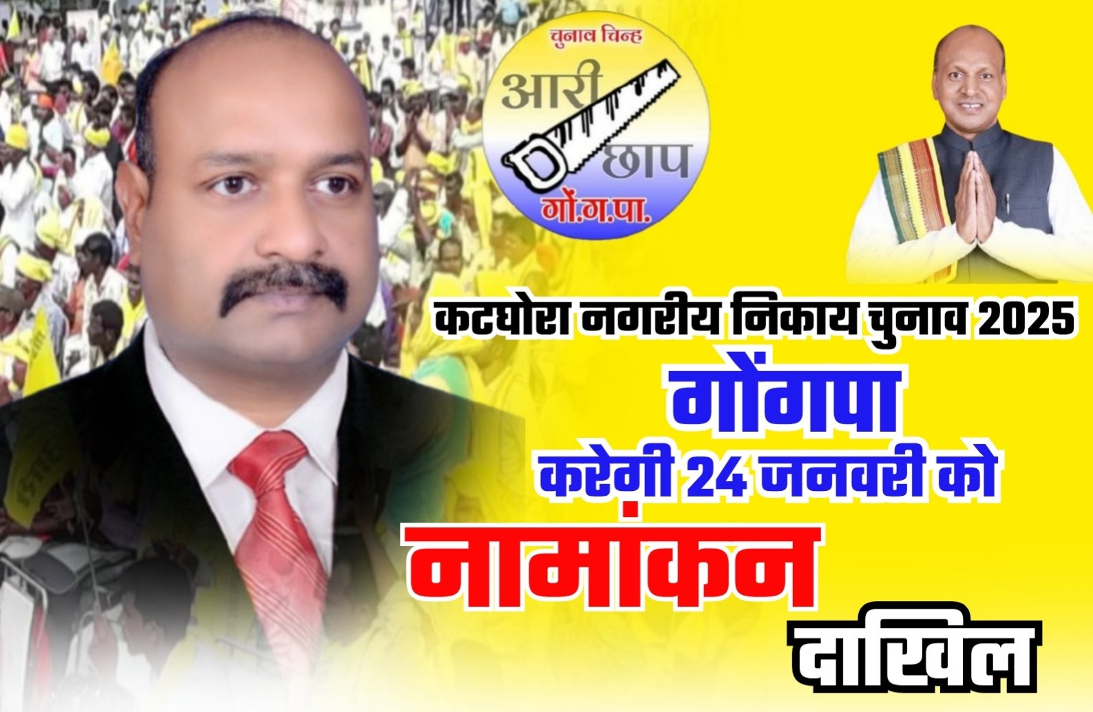 गोंडवाना गणतंत्र पार्टी (गोंगपा) ने कटघोरा नगरीय निकाय चुनाव में अपनी मजबूत उपस्थिति दर्ज कराने की तैयारी की है। गोंडवाना गणतंत्र पार्टी ने 24 जनवरी 2025 को अपना नामांकन दाखिल करने का निर्णय लिया है। संभावना जताई जा रही है कि कटघोरा नगर पालिका परिषद के अध्यक्ष पद के साथ 15 वार्डों के प्रत्याशी भी सामूहिक रूप से अपना नामांकन दाखिल कटेगी। इस मौके पर गोंगपा के राष्ट्रीय अध्यक्ष व पाली तानाखार विधायक तुलेश्वर मरकाम के साथ बड़ी संख्या में गोंगपा के क्षेत्रीय जनप्रतिनिधि व कार्यकर्ता इस नामांकन उत्सव में शामिल होंगे। पार्टी ने अध्यक्ष पद के लिए शरद देवांगन को अपना प्रत्याशी घोषित किया है और नगर पालिका के सभी 15 वार्डों में अपने प्रत्याशी उतारे हैं। यह कदम गोंगपा की रणनीति को दर्शाता है, जो इस बार कटघोरा में प्रमुख राजनीतिक दलों को चुनौती देने के लिए पूरी तरह तैयार है।