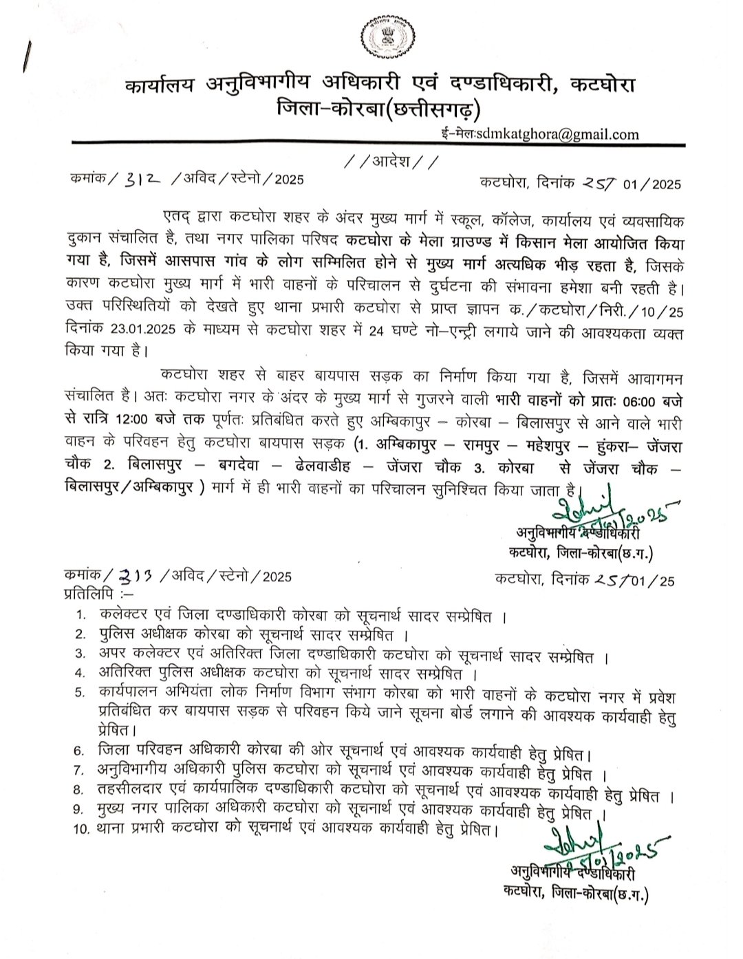 कोरबा/कटघोरा 27 जनवरी 2025 : कटघोरा शहर के अंदर मुख्य मार्ग में स्कूल, कॉलेज, कार्यालय एवं व्यवसायिक दुकान संचालित है, तथा नगर पालिका परिषद कटघोरा के मेला ग्राउण्ड में किसान मेला आयोजित किया गया है, जिसमें आसपास गांव के लोग सम्मिलित होने से मुख्य मार्ग में अत्यधिक भीड़ रहता है, जिसके कारण कटघोरा मुख्य मार्ग में भारी वाहनों के परिचालन से दुर्घटना की संभावना हमेशा बनी रहती है। उक्त परिस्थितियों को देखते हुए 23 जनवरी को थाना प्रभारी कटघोरा धर्मनारायण तिवारी से प्राप्त ज्ञापन में बढ़ते ट्रैफिक दबाव पर कटघोरा शहर में 24 घण्टे नो एन्ट्री लगाये जाने की आवश्यकता है। कटघोरा अनुविभागीय अधिकारी राजस्व रोहित सिंह ने मामले की गंभीरता पर तत्काल प्रभाव से शहर में 25 घण्टे का नो एंट्री का आदेश जारी किया है।