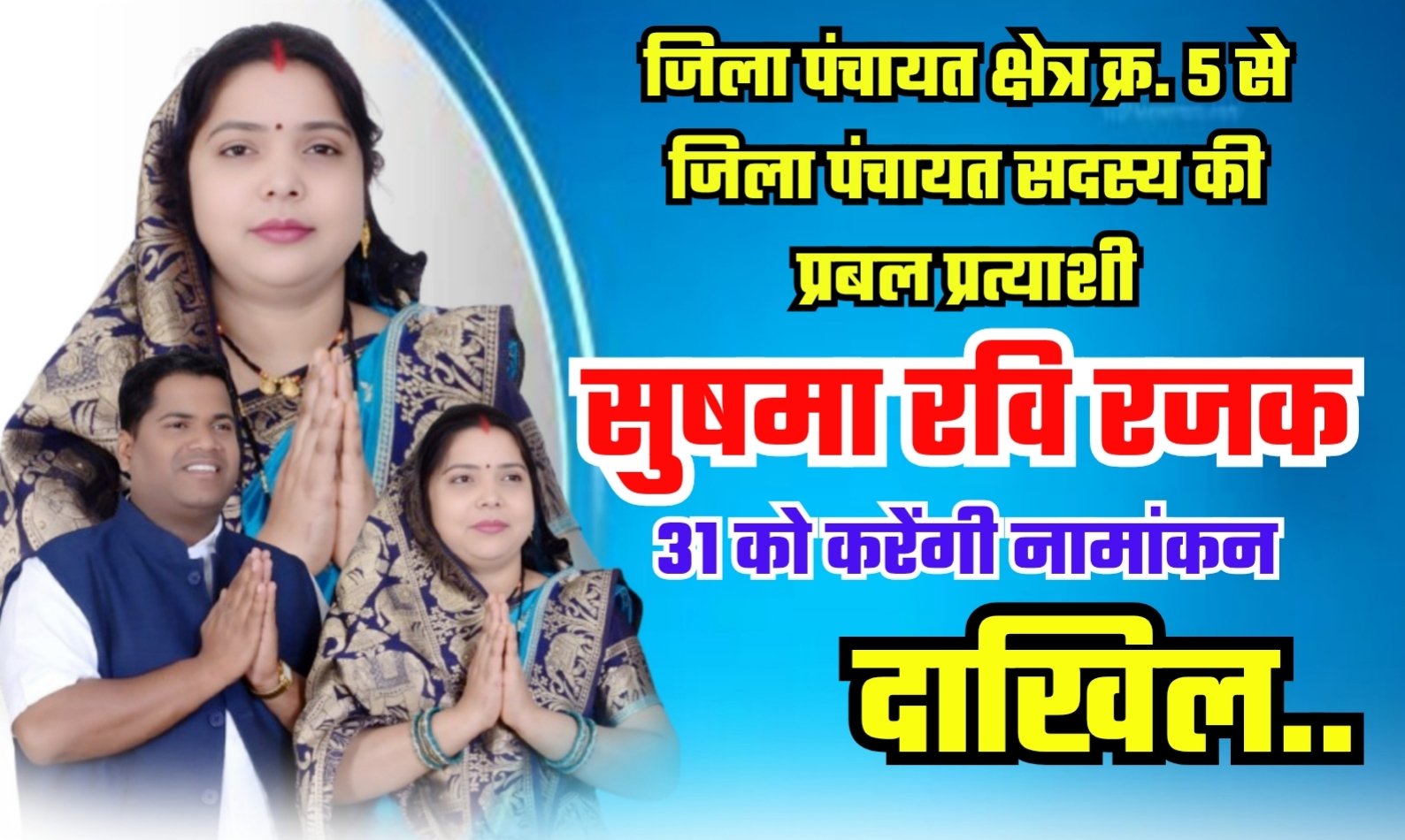जिला पंचायत क्रमांक 5 के लिए श्रीमती सुधमा रवि रजक जिला पंचायत सदस्य का चुनाव लड़ रही है। श्रीमती सुधमा रवि रजक गोंगपा समर्थित प्रत्याशी होने के साथ साथ उनकी क्षेत्र में अलग पहचान है। उन्होंने बताया कि 31 जनवरी 2025 दिन शुक्रवार को वो अपना नामांकन दाखिल करेंगी। इस मौके पर गोगपा राष्ट्रीय अध्यक्ष व पाली तानाखार विधायक तुलेश्वर मरकाम, कुलदीप मरकाम, राय सिंह मरकाम, मनोहर श्रोते तथा बड़ी संख्या के महिलाएं व ग्रामीण जन उपस्थित रहेंगे। जिला पंचायत सदस्य पद की महिला प्रत्याशी श्रीमती सुषमा रवि रजक को क्षेत्र के पंचायतो कि महिलाओ को सशक्त बनाने के साथ ही ग्राम पंचायतो के ग्रामीणों को मुलभुत सुविधाओ के साथ ही राशन कार्ड, पेंशन, आवास, शौचालय, नाली निर्माण सहित अन्य सुविधाए दिलाने का आश्वासन दे रही है जिससे ग्रामीण भी सुषमा रवि रजक का भरपूर समर्थन कर रहे है|