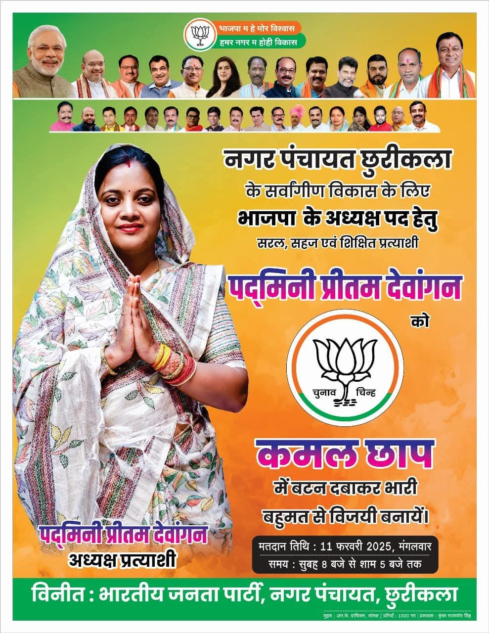 कोरबा/छुरी 3 फरवरी 2025 : नगरीय निकाय चुनाव 2025 का प्रचार प्रसार अपने चरम पर है, 11 फरवरी को मतदान तिथि होने के बाद अब प्रत्याशी घर घर जाकर लोगो से समर्थन मांग रहे हैं। छुरी नगर पंचायत से भारतीय जनता पार्टी ने श्रीमती पद्मिनी प्रीतम देवांगन को अपना प्रत्याशी चुना है। पद्मिनी देवांगन इस समय छुरी नगर पंचायत के सभी वार्डों में जाकर सघन जनसम्पर्क कर रही हैं और लोगों से आशीर्वाद लेकर समर्थन मांग रही हैं।