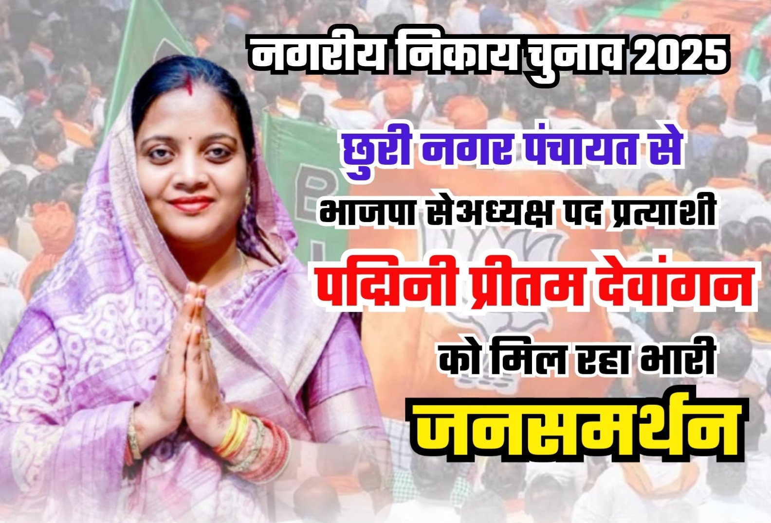 छुरी नगर पंचायत से भाजपा की अध्यक्ष प्रत्याशी पद्मिनी प्रीतम देवांगन की राजनीतिक पृष्ठभूमि और जातीय समीकरण के साथ उनका जुड़ाव उनके लिए एक बड़ा लाभकारी साबित हो रहा है। देवांगन समाज के समर्थन से उनके चुनावी अभियान को मजबूती मिल रही है। साथ ही, छुरी नगर पंचायत का कोसा व्यापारी समाज से जुड़ा होने और प्रतिष्ठित परिवारों में उनकी पहचान होने का भी चुनावी समीकरण पर सकारात्मक प्रभाव पड़ रहा है। यदि पद्मिनी देवांगन इस चुनाव में जीत हासिल करती हैं, तो यह संभवतः छुरी नगर पंचायत के विकास के लिए एक महत्वपूर्ण कदम हो सकता है। इस जीत से स्थानीय स्तर पर प्रशासन और विकास कार्यों में तेज़ी आ सकती है, जो नगरवासियों के लिए लाभकारी साबित हो सकता है।