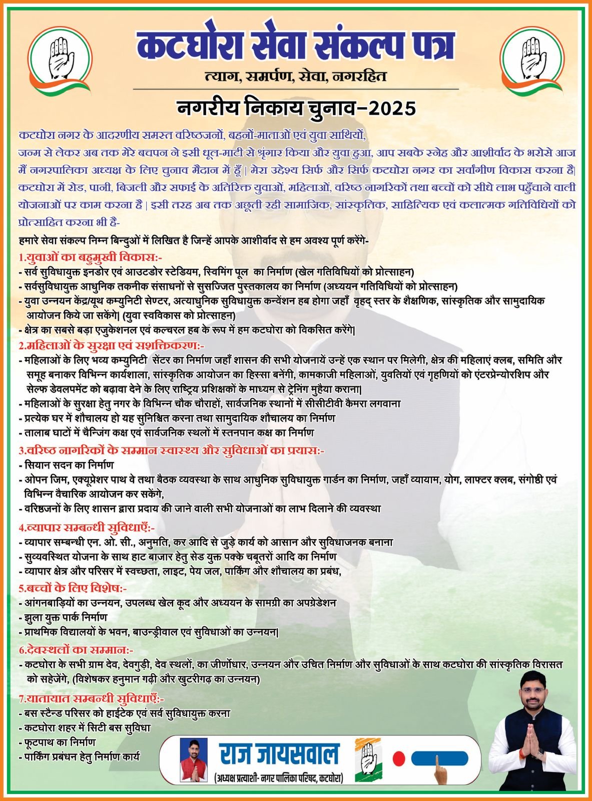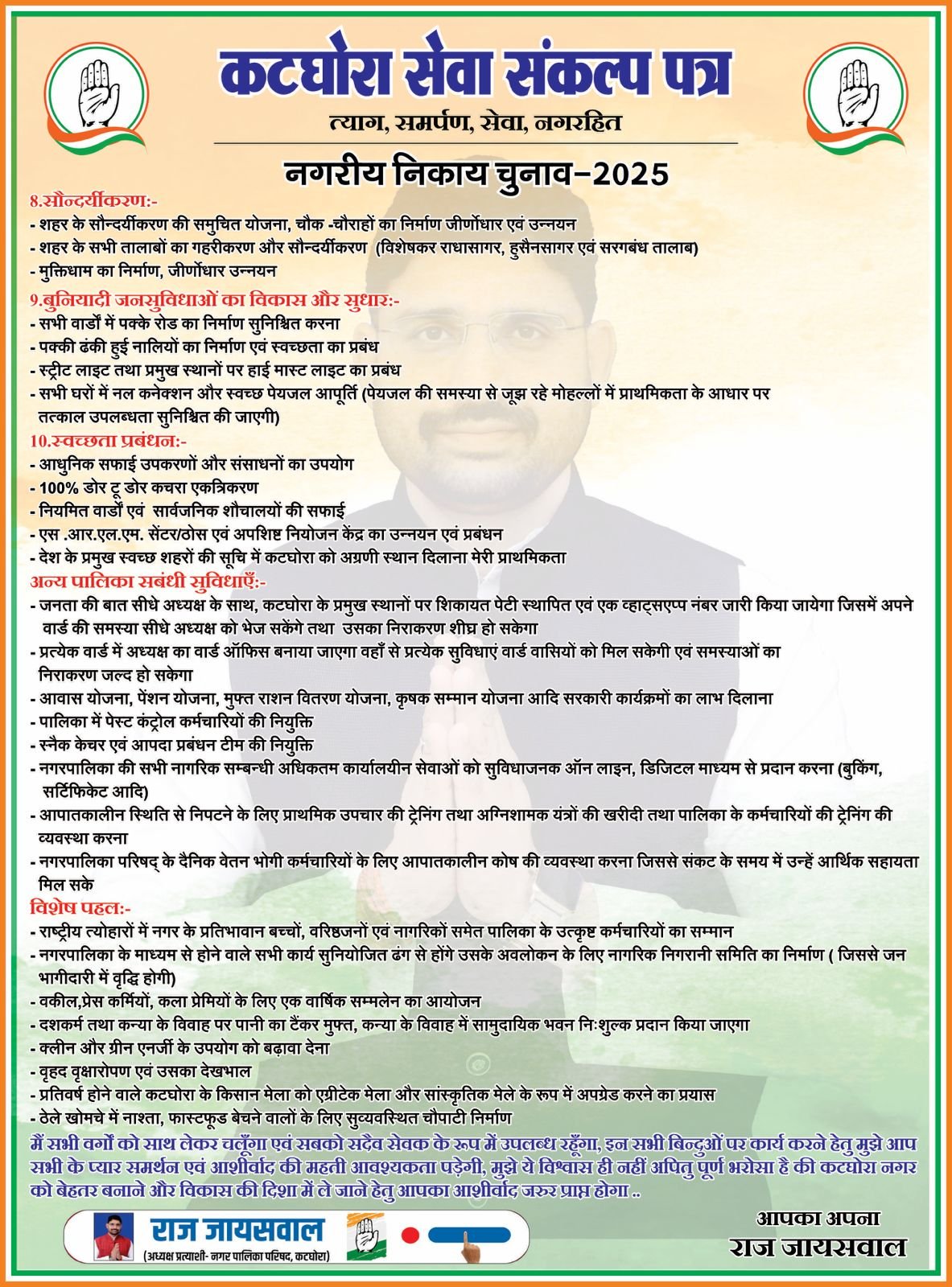 कोरबा/कटघोरा 6 फरवरी 2025 : नगरीय निकाय चुनाव 2025 को लेकर चुनाव प्रचार अपने चरम पर हैनगर पालिका कटघोरा चुनाव में कांग्रेस के युवा प्रत्याशी राज जायसवाल ने गारंटी पत्र की घोषणा करते हुए कटघोरा नगर की जनता से एक बड़ा वादा किया है कांग्रेस के अध्यक्ष प्रत्याशी राज जायसवाल ने अपना गारंटी पत्र जारी करते हुए उन्होंने कहा कि जनता के आशीर्वाद से चुनाव में जीत के बाद आने वाले 5 वर्षों के भीतर नगर में लोगों को एक बड़ी सौगात मिलेगी जिससे कटघोरा नगर पूरे प्रदेश में एक नया कीर्तिमान स्थापित करेगा। कटघोरा नगर में सर्वसुविधा युक्त अंतरराज्यीय हाईटेक बस स्टैंड का निर्माण किया जाएगा जिससे अन्य राज्यों के आने जाने वाले यात्रियों को बेहतरीन सुविधा मिल सकेगी। साथ ही नगर में स्थित प्राचीन तालाब जैसे राधासागर तालाब, हुसैन सागर तालाब, सरगबन्द तालाब, छिर्रा तालाब, महेशपुर तालाब, कासनिया तालाब, कंवर तालाब जो वर्तमान में दलदल में तब्दील हो चुका है उसका आधुनिकीकरण के साथ जीर्णोद्धार कराया जाएगा। कांग्रेस प्रत्याशी राज जायसवाल ने अपने गारन्टी पत्र में आने वाले 5 वर्षों में नगरवासियों की सुविधा को देखते हुए घोषणा किया है आइये देखते है की जारी गारन्टी पत्र के क्या कुछ खास है।