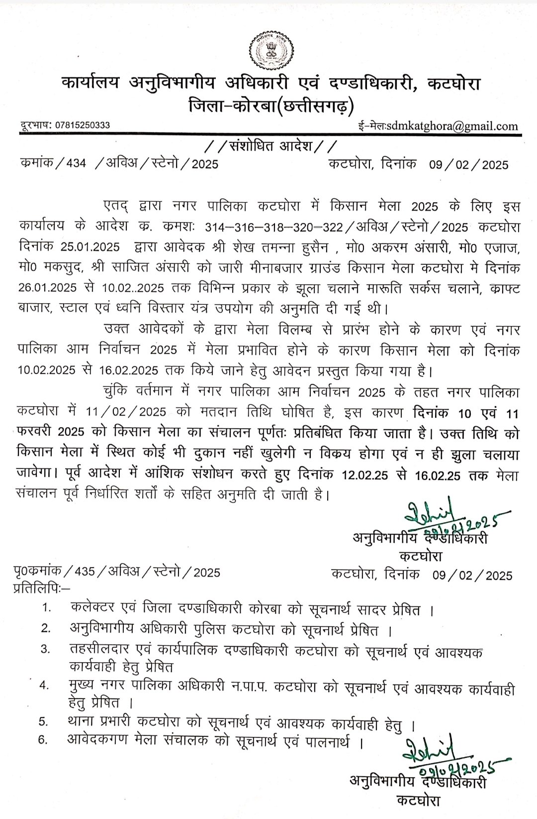 उक्त आवेदकों के द्वारा मेला विलम्ब से प्रारंभ होने के कारण एवं नगर पालिका आम निर्वाचन 2025 में मेला प्रभावित होने के कारण किसान मेला को दिनांक 10 फरवरी से 16 फरवरी तक किये जाने हेतु आवेदन प्रस्तुत किया गया था। चुंकि वर्तमान में नगर पालिका आम निर्वाचन 2025 के तहत नगर पालिका कटघोरा में 11/02/2025 को मतदान तिथि घोषित है, इस कारण दिनांक 10 एवं 11 फरवरी 2025 को किसान मेला का संचालन पूर्णतः प्रतिबंधित किया जाता है। उक्त तिथि को किसान मेला में कोई भी दुकान नहीं खुलेगी न विकय होगा एवं न ही झुला चलाया जावेगा। पूर्व आदेश में आंशिक संशोधन करते हुए दिनांक 12.02.25 से 16.02.25 तक मेला संचालन पूर्व निर्धारित शर्तों के सहित अनुमति दी कटघोरा अनुविभागीय अधिकारी राजस्व रोहित सिंह द्वारा दी गई है।