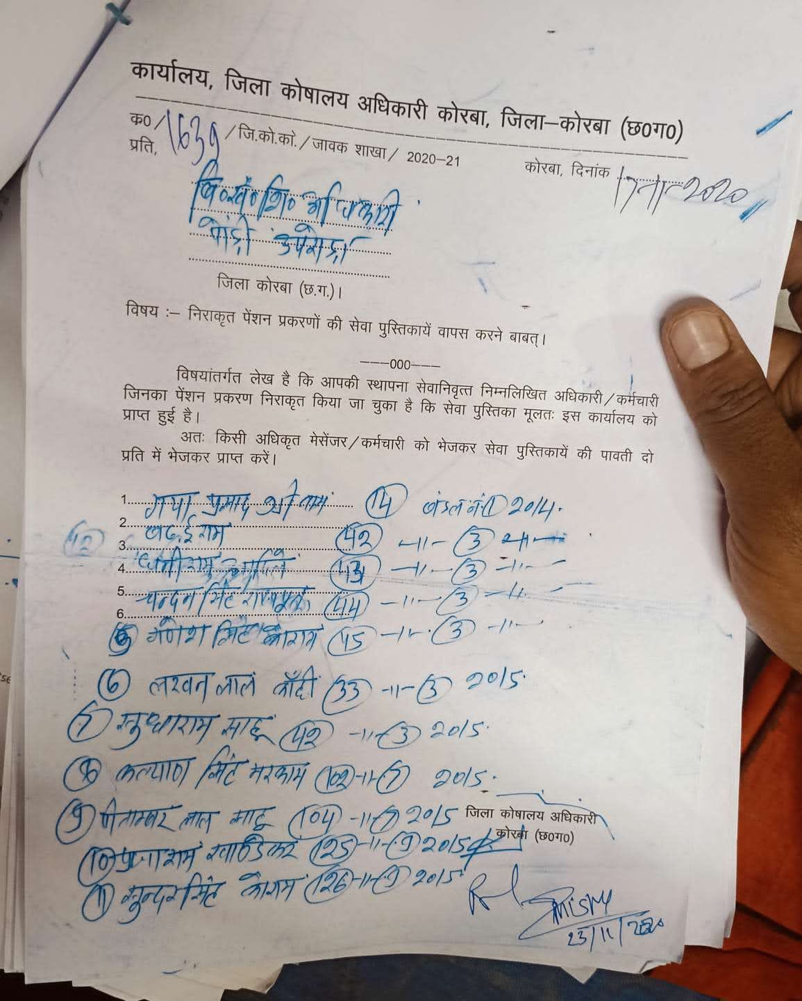 प्रधान पाठक चंदन सिंह राजपूत जो कि कोनकोना स्कूल से वर्ष 2014 में सेवानिवृत हुए, इस दौरान उन्होंने अपनी सेवा पुस्तिका में ओरिजनल कई दस्तावेज भी जमा कर रखे थे। अति आवश्यकता पड़ने पर पेंशनधारी चंदन सिंह ने सेवा पुस्तिका की मांग की तो खण्ड कार्यालय से जानकारी मिली कि सभी कागजात पेंशन कार्यालय बिलासपुर संभाग में भेजे जा चुके हैं। चंदन सिंह ने बिलासपुर में पेंशन कार्यालय जाकर सेवा पुस्तिका क़ा पता किया तो बताया गया कि कोरबा कोषालय में उनके सेवा पुस्तिका को भेज दिया गया है। चंदन सिंह ने कोरबा कोषालय में जानकारी ली तो बताया गया कि पोड़ी उपरोड़ा में बीइओ के नाम से सेवा पुस्तिका मांग के लिए आवेदन करें। चंदन सिंह ने पोड़ी खण्ड शिक्षा कार्यालय में सेवा पुस्तिका मांग के लिए आवेदन किया, जहाँ मौजूद बाबू ने उक्त आवेदन कोरबा कोषालय में जमा किया। उसके बाद एक हफ्ते तक कोषालय के कर्मचारी सेवा पुस्तिका की खोजबीन करते रहे।