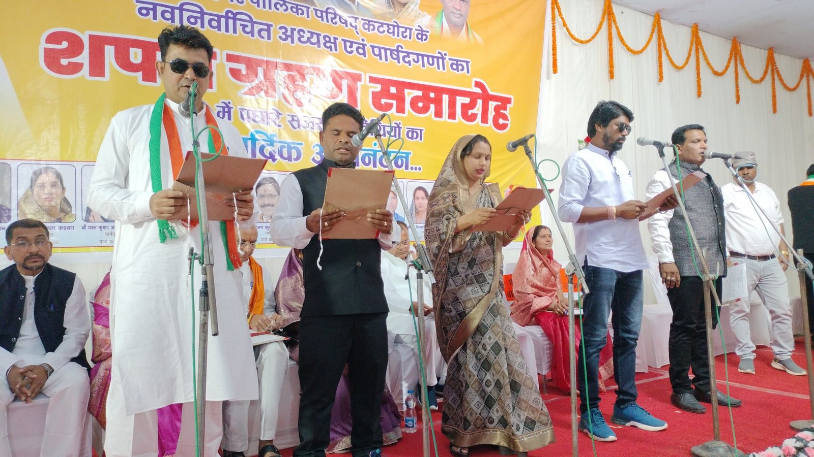 कटघोरा अनुविभागीय अधिकारी व रिटर्निंग ऑफिसर रोहित सिंह ने अध्यक्ष राज जायसवाल समेत 15 वार्डों के पार्षदों को पद एवं गोपनोयता की शपथ दिलाई और सभी बधाई दी।  शपथ ग्रहण करने के बाद मंचस्थ अतिथि सांसद ज्योत्सना चरणदास महंत, हरीश परसाई, पूर्व कटघोरा विधायक पुरुषोत्तम कंवर, पूर्व नगर पालिका अध्यक्ष रतन मित्तल, शहर कांग्रेस कमेटी अध्यक्ष राजीव लखनपाल, ब्लॉक अध्यक्ष गोरेलाल यादव ने सभी को पुष्पगुच्छ भेंट कर बधाई एवं शुभकामनाये दी। सांसद ज्योत्सना चरणदास महत ने सभी जनप्रतिनिधियों को बधाई दी। उन्होंने कहा कि हमारा प्रमुख उद्देश्य अपने नगर और क्षेत्र में जनसुविधाओं का विस्तार और अधोसंरचना निर्माण से कटघोरा नगर को एक विकसित एवं आदर्श नगर के रूप में विशेष पहचान दिलाना है, जिसके लिए आज शपथ लेने के बाद कृतसंकल्पित हैं।