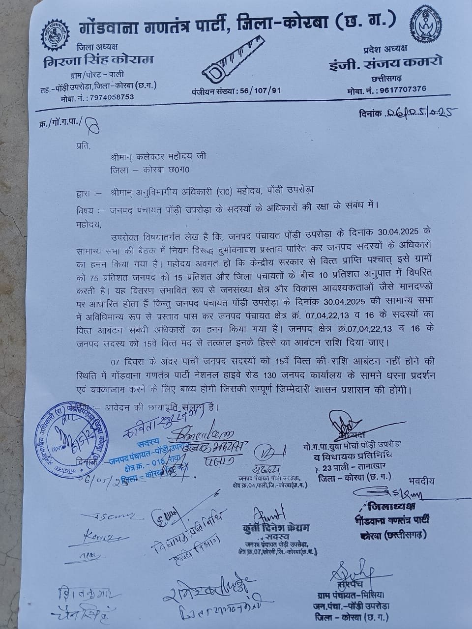 जनपद पंचायत पोड़ी-उपरोड़ा में वित्तीय अधिकारों को लेकर विवाद गहराया, गोंडवाना गणतंत्र पार्टी ने दी चक्काजाम की चेतावनी.
