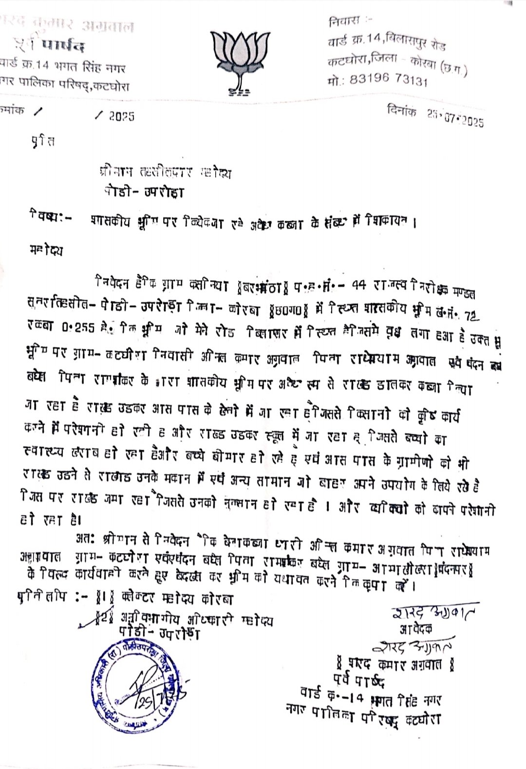 कोरबा/कटघोरा 26 जुलाई 2025 : कटघोरा नगर पालिका परिषद के वार्ड क्रमांक 15 में पौनी पसारी के समीप शासकीय भूमि पर नगर के कुछ रसूखदारों द्वारा बेख़ौफ़ अतिक्रमण किया जा रहा है। जिसे लेकर वार्ड क्रमांक 14 के भाजपा नेता व पूर्व पार्षद शरद गोयल ने अनुविभागीय अधिकारी राजस्व पोंडी उपरोडा, तहसीलदार पोंडी उपरोडा को लिखित शिकायत कर उक्त शासकीय भूमि की उचित जांच कर दोषियों पर कार्यवाही करें।