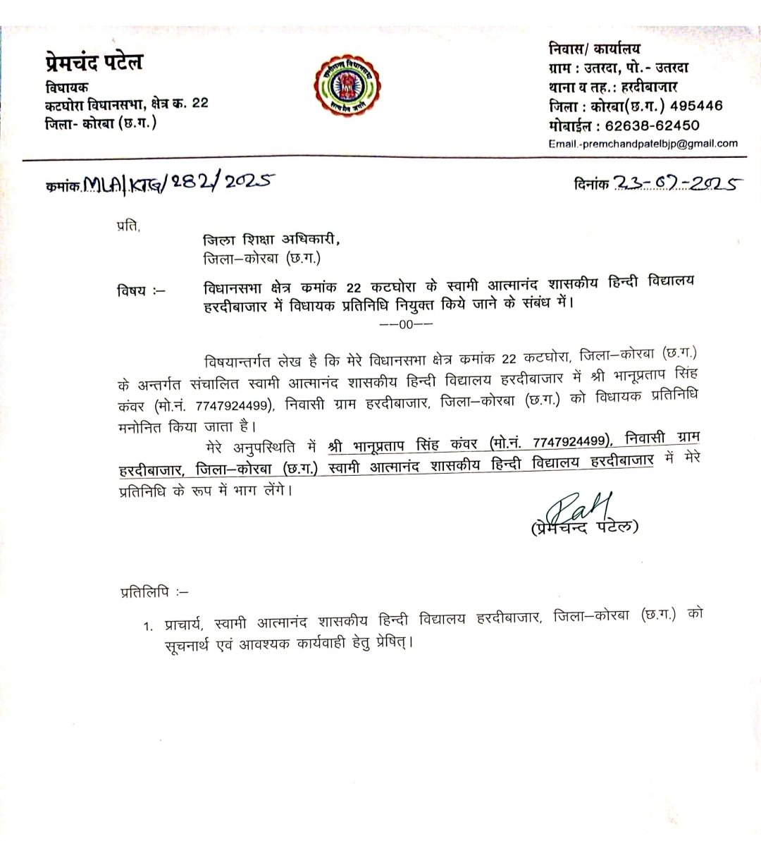 ktg news : कटघोरा विधायक प्रेमचंद पटेल ने भानूप्रताप सिंह कंवर को स्वामी आत्मानंद विद्यालय हरदीबाजार का विधायक प्रतिनिधि किया नियुक्त.