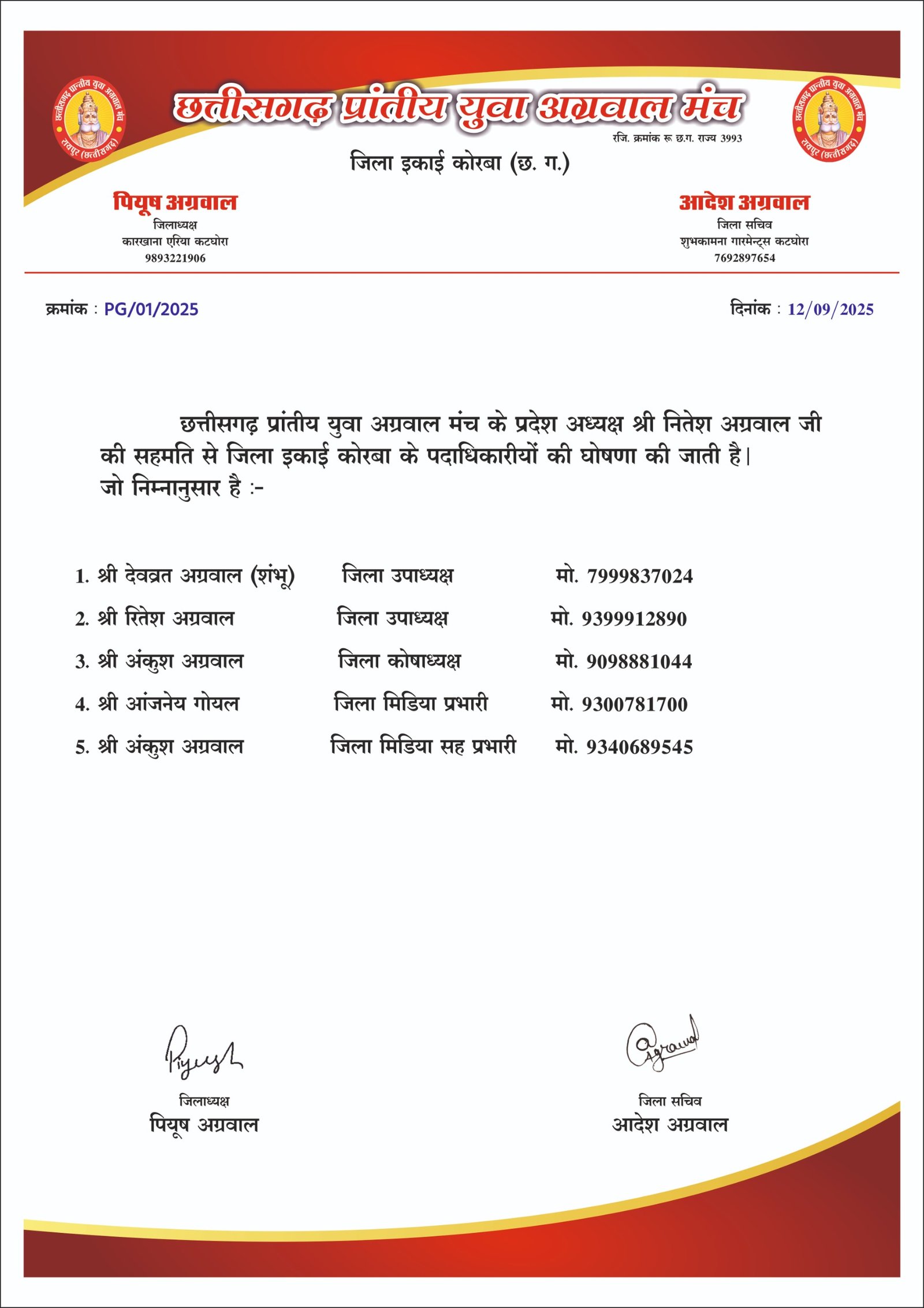 कोरबा/कटघोरा, 12 सितंबर 2025। छत्तीसगढ़ प्रांतीय युवा अग्रवाल मंच की कोरबा जिला इकाई का गठन कर दिया गया है। प्रदेश अध्यक्ष नितेश अग्रवाल रायपुर की सहमति से जिला अध्यक्ष पीयूष अग्रवाल ने जिला स्तर पर नई टीम की घोषणा की।