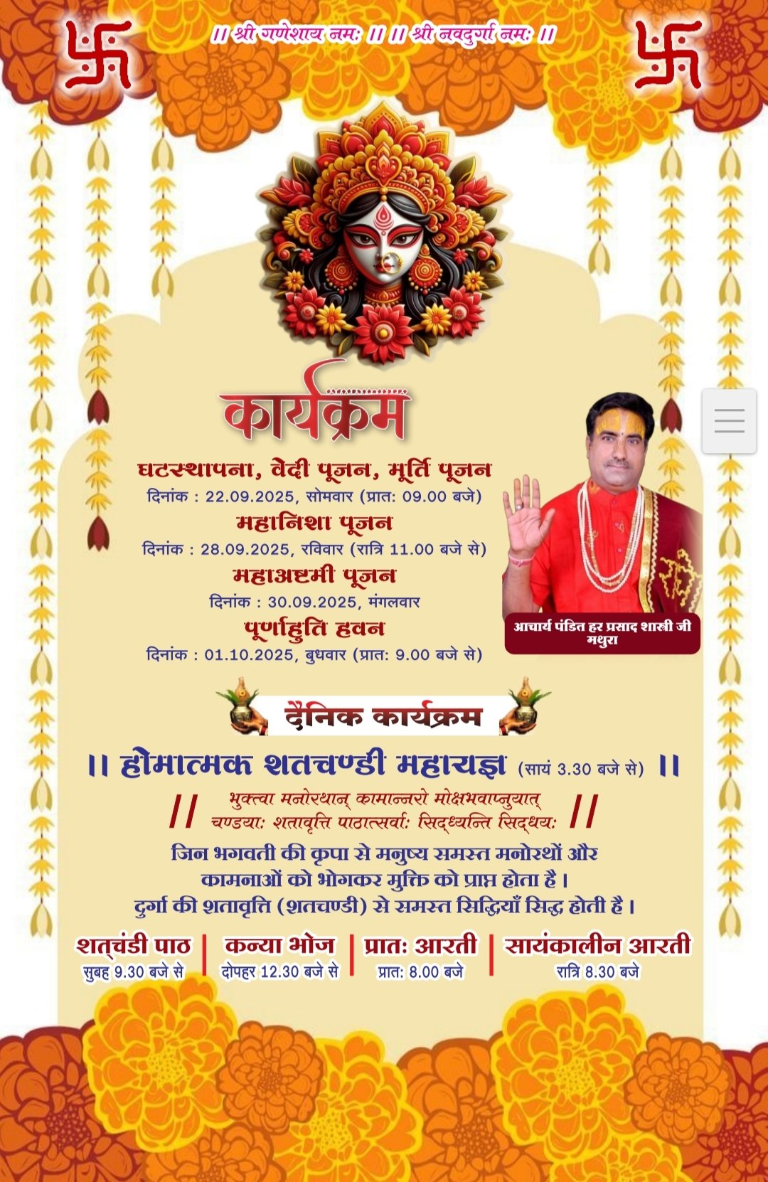 घटस्थापना, वेदी पूजन एवं मूर्ति पूजन : 22 सितंबर 2025, सोमवार प्रातः 9.00 बजे से