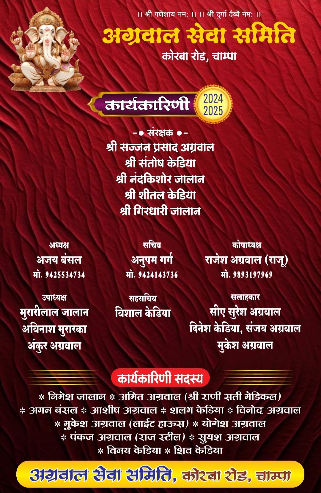 कार्यक्रम का संचालन अग्रवाल सेवा समिति, कोरबा रोड, चाम्पा द्वारा किया जा रहा है। समिति के संरक्षक श्री सज्जन प्रसाद अग्रवाल, श्री संतोष केडिया, श्री नंदकिशोर जालान, श्री शीतल केडिया एवं श्री गिरधारी जालान हैं। अध्यक्ष अजय बंसल, सचिव अनुपम गर्ग और कोषाध्यक्ष राजेश अग्रवाल (राजू) हैं। इनके साथ मुरारीलाल जालान, अविनाश मुरारका, अंकुर अग्रवाल (उपाध्यक्ष) एवं अन्य पदाधिकारी और कार्यकारिणी सदस्य सक्रिय रूप से आयोजन की तैयारियों में जुटे हुए हैं।