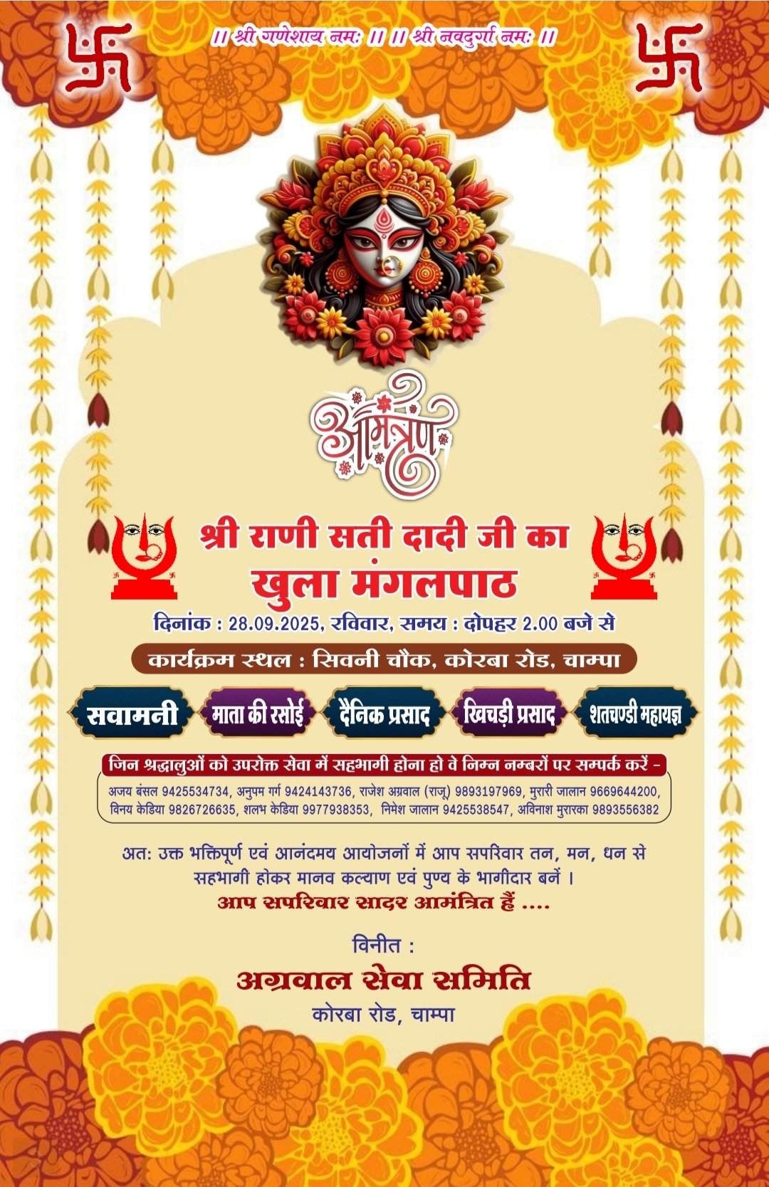 श्री राणी सती दादी जी का खुला मंगलपाठ : 28 सितंबर 2025, रविवार, दोपहर 2.00 बजे से