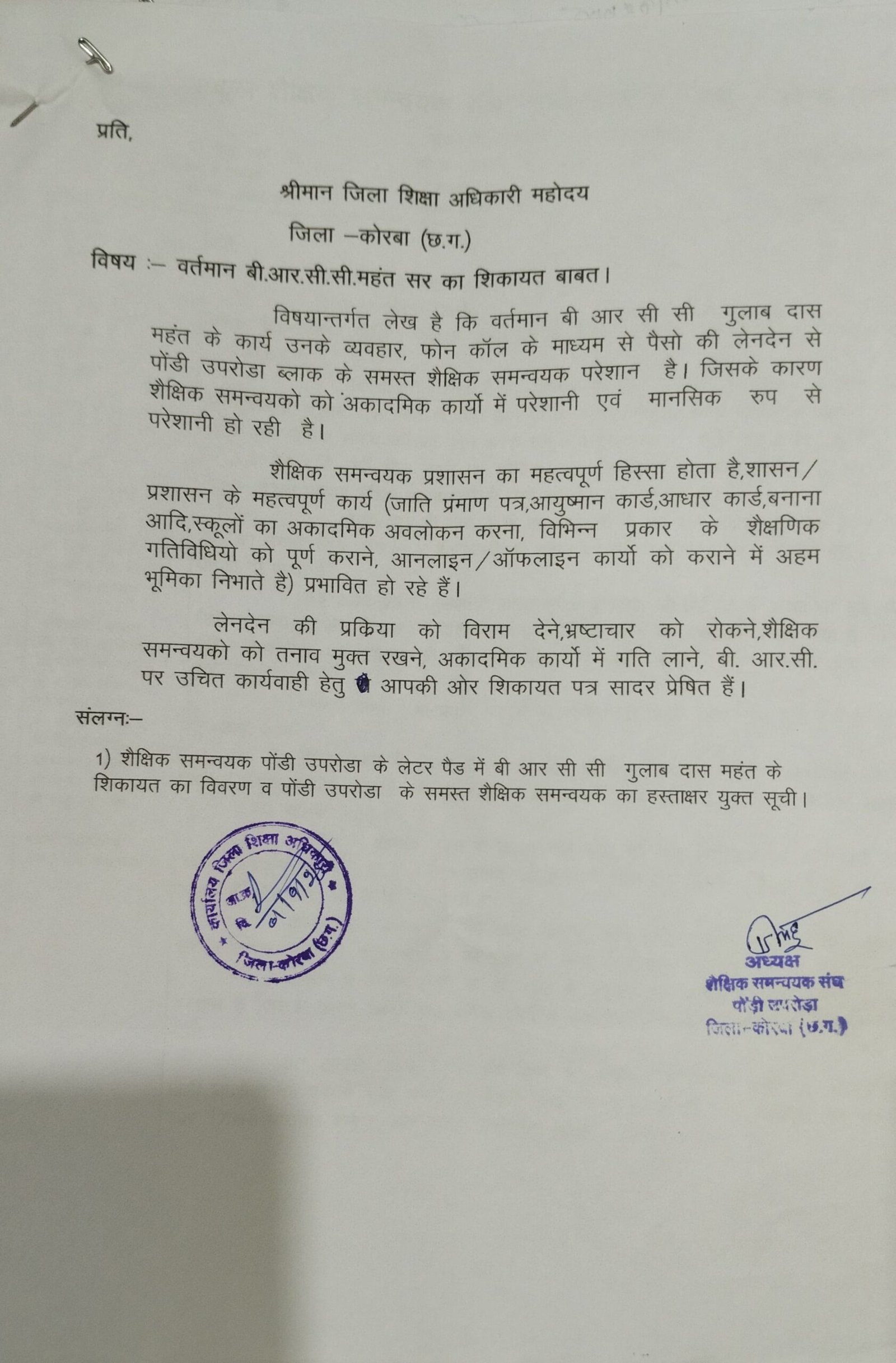 कोरबा/पोंडी उपरोड़ा 18 सितंबर 2025 : पोड़ी-उपरोड़ा विकासखण्ड में पदस्थ स्त्रोत समन्वयक (बीआरसीसी) गुलाबदास महंत पर गंभीर आरोप लगाए गए हैं। संकुल शैक्षिक समन्वयकों ने जिला शिक्षा अधिकारी को 1 सितम्बर 2025 को पत्र लिखकर बताया कि था महंत द्वारा लगातार पैसों की अवैध मांग और धमकियां दी जाती हैं, जिससे शैक्षिक समन्वयक मानसिक रूप से परेशान हैं और अकादमिक कार्यों में व्यवधान आ रहा है। लेकिन आज 17 दिन बीत चुके हैं जिला प्रसासन ने मामले में जिले से कोई भी जांच अधिकारी नियुक्त नहीं किये इससे यह झकलता है कि BRC महंत को बचाने कि कोसिस कि जा रही हैं।जानकारी ये भी मिल रही कि BRC द्वारा निरिक्षण के नाम पर CAC लोगो से कोरे कागज़ में हस्ताक्षर भी कराये जा रहे हैं ताकि जांच के दायरे में बच सकें।