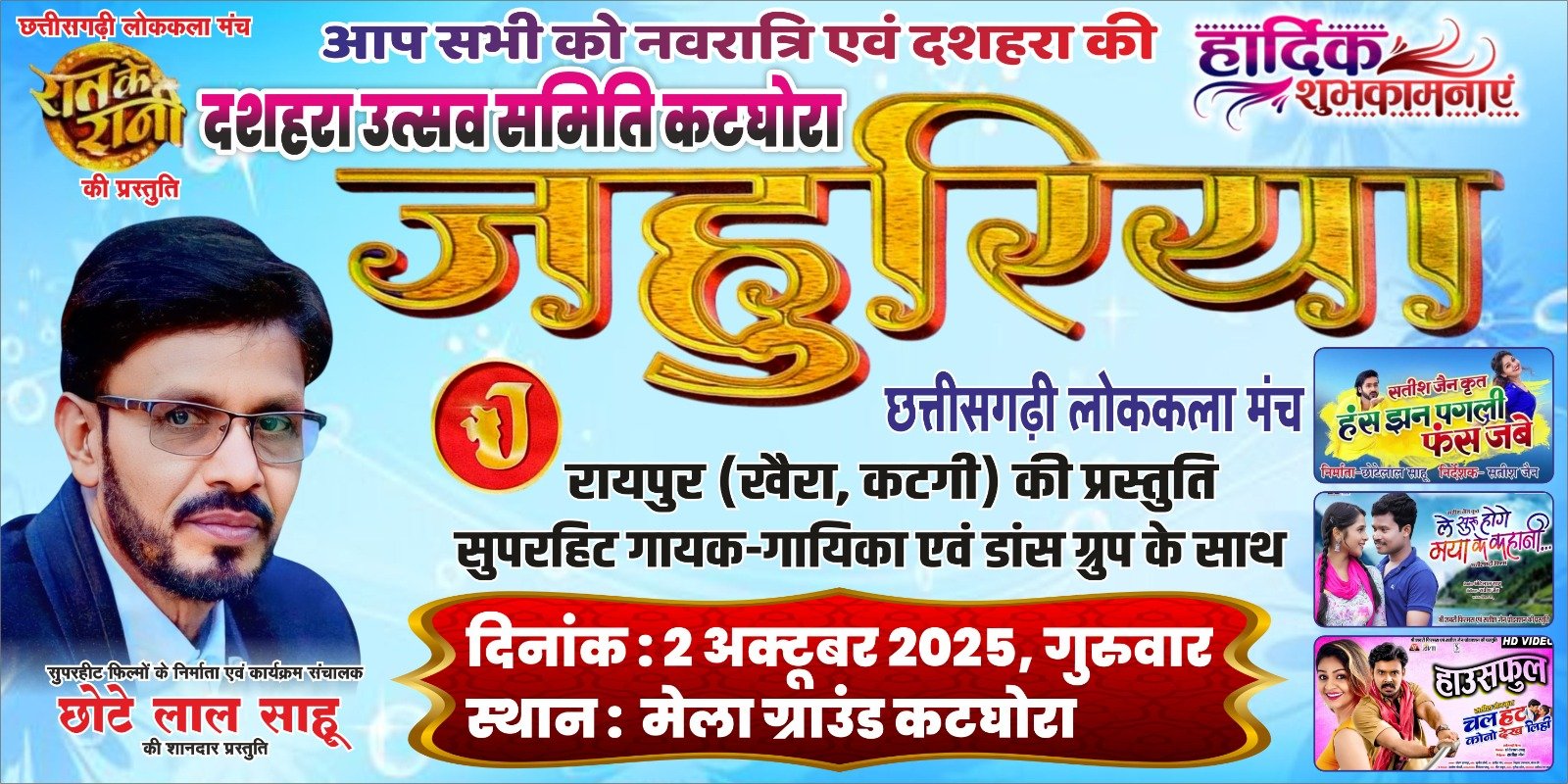 आयोजन समिति द्वारा इस वर्ष सांस्कृतिक कार्यक्रमों को भी खास बनाया गया है। छत्तीसगढ़ के प्रसिद्ध फिल्म निर्माता छोटे लाल साहू, जिन्होंने हंस झन पगली फंस जाबे, ले शुरू होंगे मया के कहानी, चल हट कोनो देख लिही जैसी हिट फिल्में बनाई हैं, उनके प्रसिद्ध लोककला मंच “जहुरिया” की विशेष प्रस्तुति होगी। इस मंच पर सुपरहिट गायक-गायिका और डांस ग्रुप दर्शकों को झूमने पर मजबूर करेंगे।