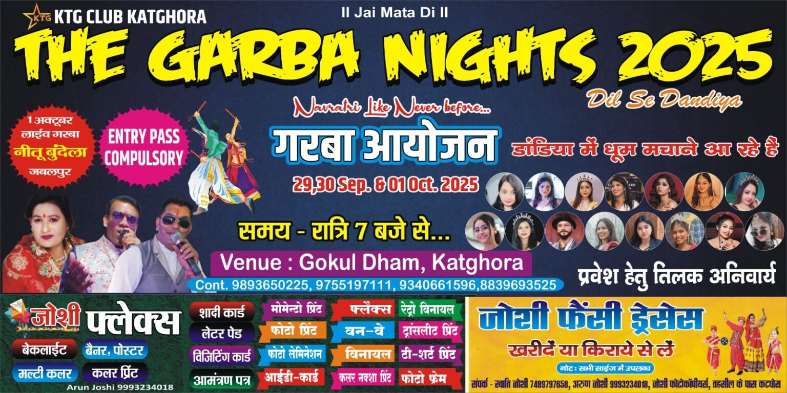 ktg news : 29 सितंबर से कटघोरा में होगा 3 दिवसीय भव्य गरबा नाइट महोत्सव.. जबलपुर के नीतू बुंदेला और 15 कलाकार देंगे अपनी खास प्रस्तुति.