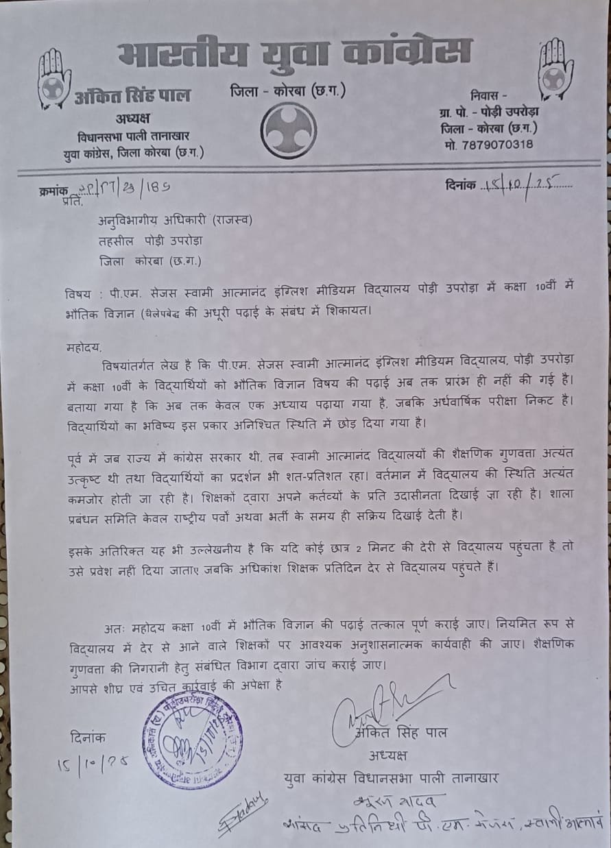 कोरबा/पोड़ी उपरोड़ा 16 अक्टूबर 2025 : स्वामी आत्मानंद अंग्रेजी माध्यम विद्यालय, पोड़ी उपरोड़ा की शिक्षा व्यवस्था को लेकर अभिभावकों और विद्यार्थियों में भारी असंतोष देखने को मिल रहा है। कक्षा 10वीं के छात्रों ने बताया कि सत्र का आधे से अधिक समय बीत जाने के बावजूद भौतिक विज्ञान (फिजिक्स) जैसे महत्वपूर्ण विषय की पढ़ाई अब तक पूरी नहीं हो पाई है। इससे छात्रों के भविष्य पर संकट मंडरा रहा है, क्योंकि अर्धवार्षिक परीक्षाएं निकट हैं और छात्रों को सिर्फ एक अध्याय ही पढ़ाया गया है। विद्यालय प्रबंधन ने इस स्थिति के लिए शिक्षक की कमी को जिम्मेदार ठहराया है। वहीं, छात्रों और अभिभावकों का कहना है कि शासन और प्रशासन द्वारा इस ओर ध्यान न देने से शिक्षा की गुणवत्ता पर प्रतिकूल प्रभाव पड़ रहा है।