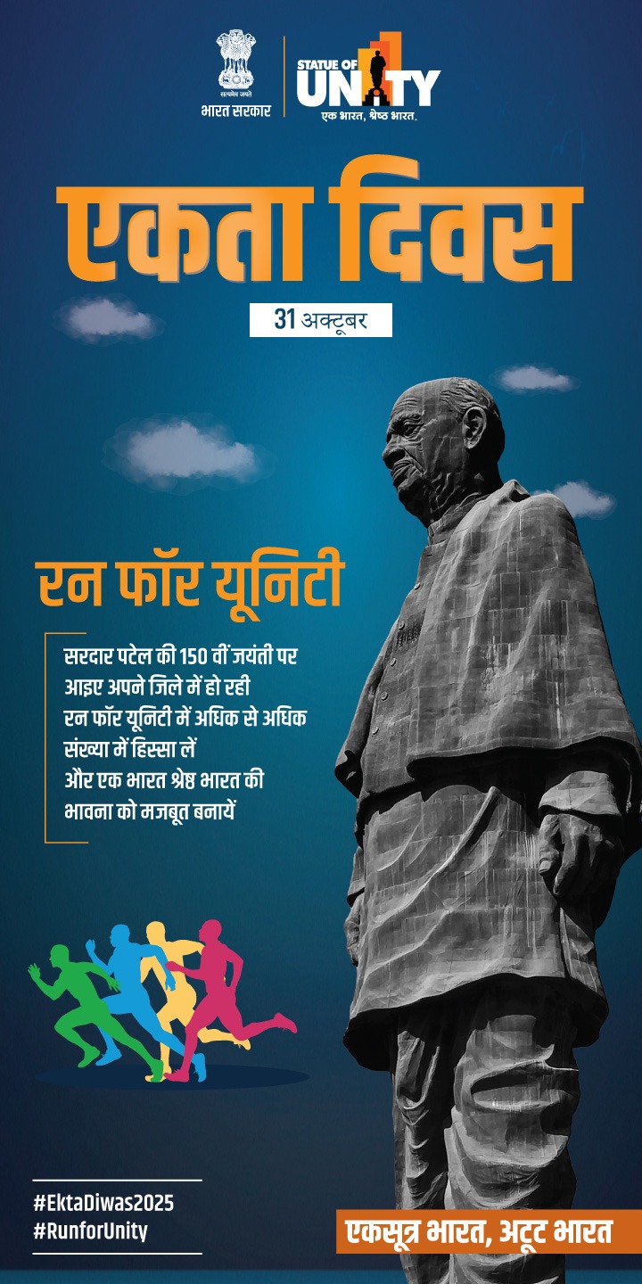 कोरबा/कटघोरा, 29 अक्टूबर 2025: देश के लौहपुरुष सरदार वल्लभभाई पटेल की 150वीं जयंती के अवसर पर 31 अक्टूबर को पूरे देश में ‘रन फॉर यूनिटी’ का आयोजन किया जा रहा है। प्रधानमंत्री श्री नरेन्द्र मोदी ने इस अवसर पर देशवासियों से आह्वान किया है कि वे राष्ट्रीय एकता दिवस पर आयोजित इस कार्यक्रम में बढ़-चढ़कर भाग लें और एकता, अखंडता तथा भाईचारे का संदेश दें।