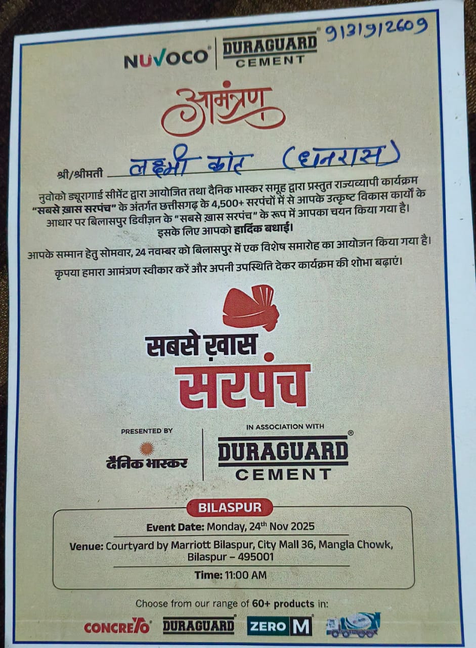 कोरबा/कटघोरा, 27 नवम्बर 2025: बिलासपुर में 24 नवम्बर को दैनिक भास्कर एवं नावेको ड्यूरागार्ड सीमेंट द्वारा संयुक्त रूप से आयोजित प्रतिष्ठित “खास सरपंच सम्मान” समारोह में कोरबा जिले का नाम एक बार फिर गौरवान्वित हुआ। कटघोरा विकासखंड के ग्राम पंचायत धनरास के सरपंच लक्ष्मीकांत कंवर को उनके उत्कृष्ट कार्य, जनसेवा और ग्राम विकास के उल्लेखनीय प्रयासों के लिए सम्मानित किया गया।