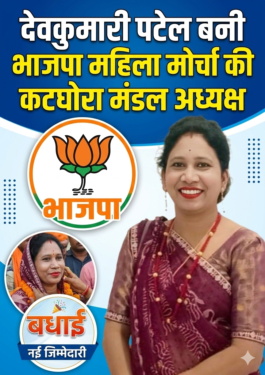 देवकुमारी पटेल को कटघोरा महिला मोर्चा मंडल अध्यक्ष बनाए जाने की खबर मिलते ही भाजपा कार्यकर्ताओं और महिला मोर्चा से जुड़ी सदस्यों में खुशी की लहर दौड़ गई। पार्टी के कार्यकर्ताओं और समर्थकों ने इसे संगठन के लिए सकारात्मक निर्णय बताया है। देवकुमारी पटेल लंबे समय से सामाजिक और राजनीतिक गतिविधियों से जुड़ी रही हैं। वे पार्टी की विचारधारा को जन-जन तक पहुंचाने और महिला संगठन को मजबूत करने के लिए लगातार सक्रिय भूमिका निभाती रही हैं। संगठन के प्रति उनकी निष्ठा, सक्रियता और कार्यशैली को देखते हुए पार्टी ने उन्हें यह महत्वपूर्ण जिम्मेदारी सौंपी है।