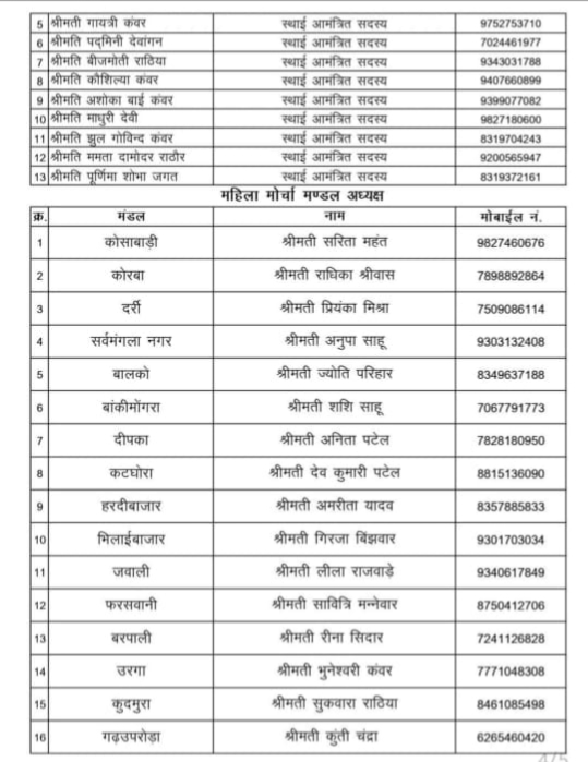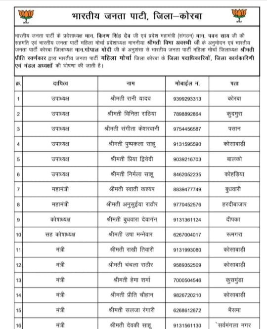 यह नियुक्ति भारतीय जनता पार्टी के प्रदेशाध्यक्ष किरण सिंह देव तथा प्रदेश महामंत्री (संगठन) पवन साय की सहमति से की गई है। साथ ही भाजपा महिला मोर्चा की प्रदेशाध्यक्ष श्रीमती विभा अवस्थी के अनुमोदन और भाजपा कोरबा जिलाध्यक्ष गोपाल मोदी की अनुशंसा पर महिला मोर्चा जिलाध्यक्ष प्रीति स्वर्णकार ने जिला कोरबा के महिला मोर्चा पदाधिकारियों और मंडल अध्यक्षों की आधिकारिक घोषणा की।